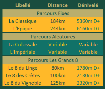 Les parcours Fixes et Aléatoires empruntent un itinéraire commun caractérisé par les 10 ascensions suivantes :