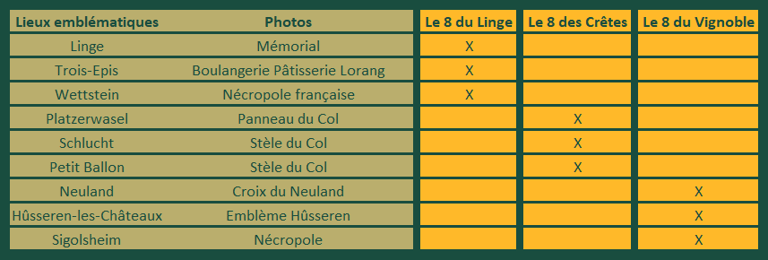 Atteindre le sommet des 10 ascensions ci-dessous en traçant son propre itinéraire à partir d’un point de départ donné (Turckheim). Chaque sommet constitue un checkpoint, un point de passage obligatoire qui doit être atteint par le Participant. Le but n’est pas de gravir les 10 ascensions mais d’en atteindre le sommet.